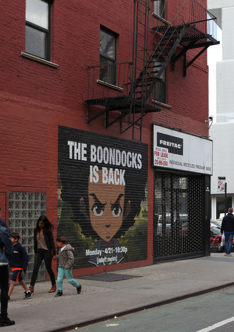 The Boondocks is a Peabody Award-winning animated sitcom on Cartoon Network late-night programming block,Adult Swim. The series was created by Aaron McGruder offers a modern perspective on culture, class, and race relations. Following three critically-acclaimed seasons in 2005, 2007, and 2010, the series went on hiatus until 2014. To announce the release of the 4th and final season, Adult Swim enlisted Overall Murals to produce a teaser campaign in NYC, featuring a black-and-white silhouette of the iconic main character, Huey, with no text other than the release date. The images produced a whirlwind of positive social media, which was renewed three weeks later when two vibrant, full-color portraits with full network release details were produced in both NYC and Philadelphia.