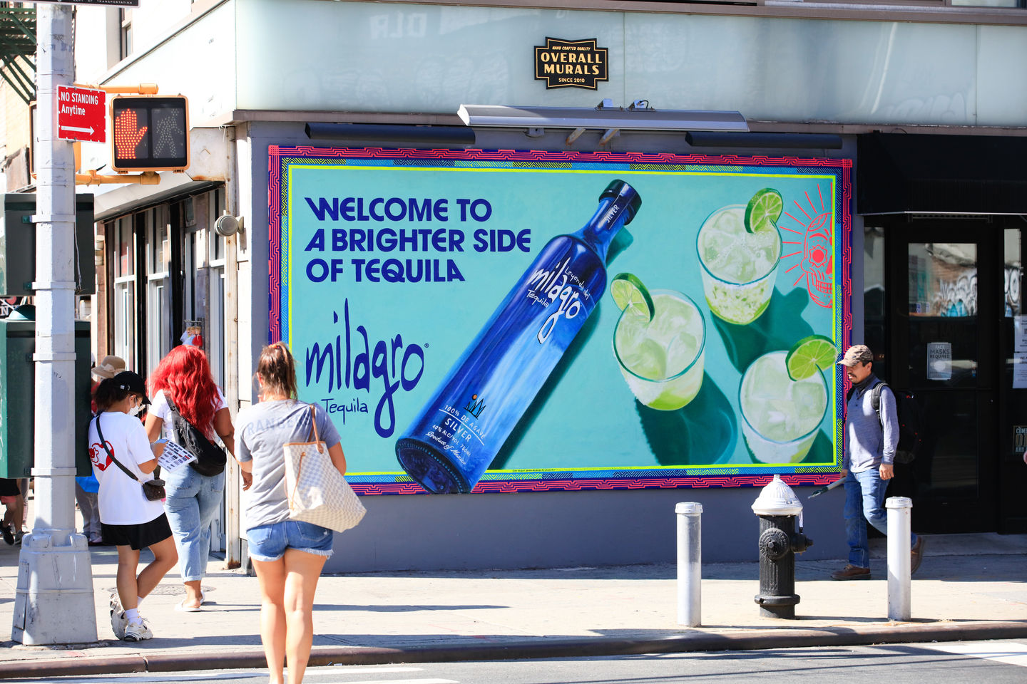 Overall Murals took the Tequila's memorable bottle design and added fluorescent neon shades to highlight the liquor brand's best assets. We applied Fluorescent blue paint to the bottle, yellow, blue, and pink neon to the border, and a bit of neon green paint to the limes to create a vibrant glow that grabbed the attention of pedestrians and brought tequila Tuesday to every day and night!