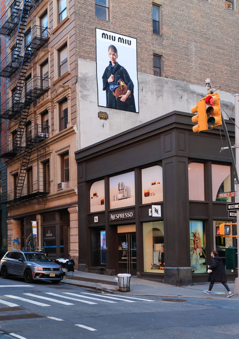 Since early 2023, Miu Miu has utilized our Soho wallscape, strategically situated on the same block as the Miu Miu retail store on Prince and Mercer Street intersection, ingeniously tapping into the neighborhood's high-end artistic community and vibrant atmosphere.