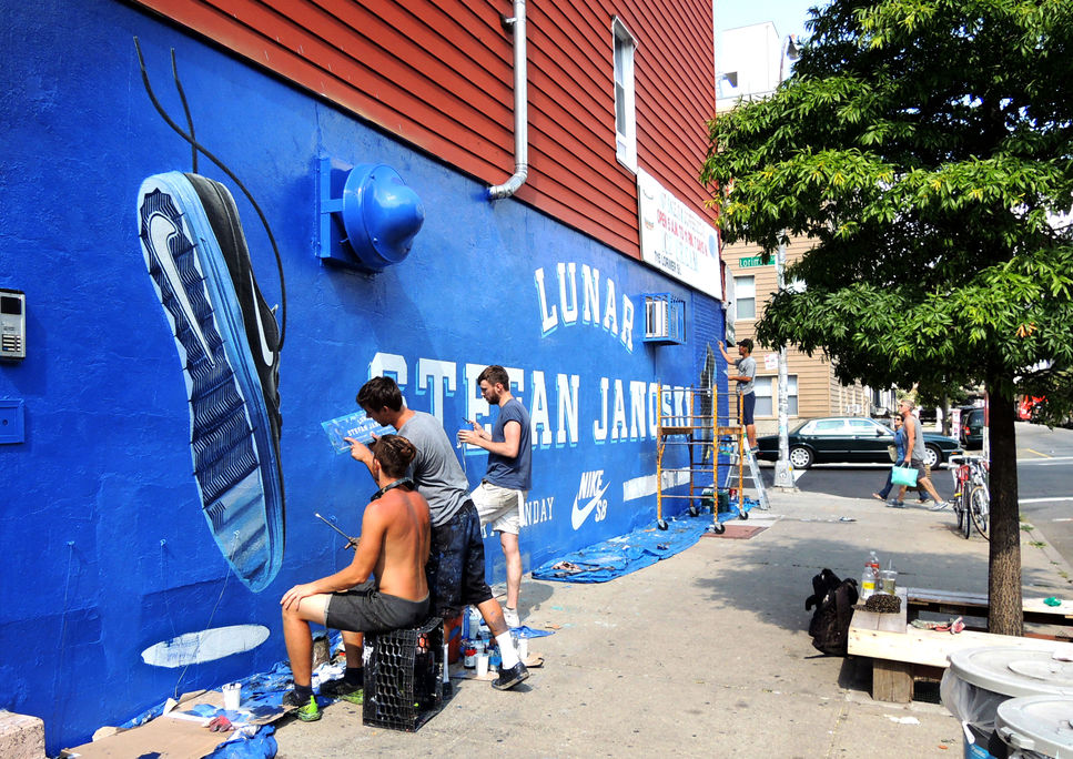 The paintings of the shoes were strategically placed near popular Brooklyn skate parks in Gowanus and Williamsburg. These walls were meticulously adorned with the shoes' rich textures on top of a background made up of a soft blue gradient. Nike's #skateeverydamnday is the central message of the two murals, which several young and seasoned skaters positively responded to by stopping by to snap photos and chat with Overall Murals painters as they brought these murals to life.