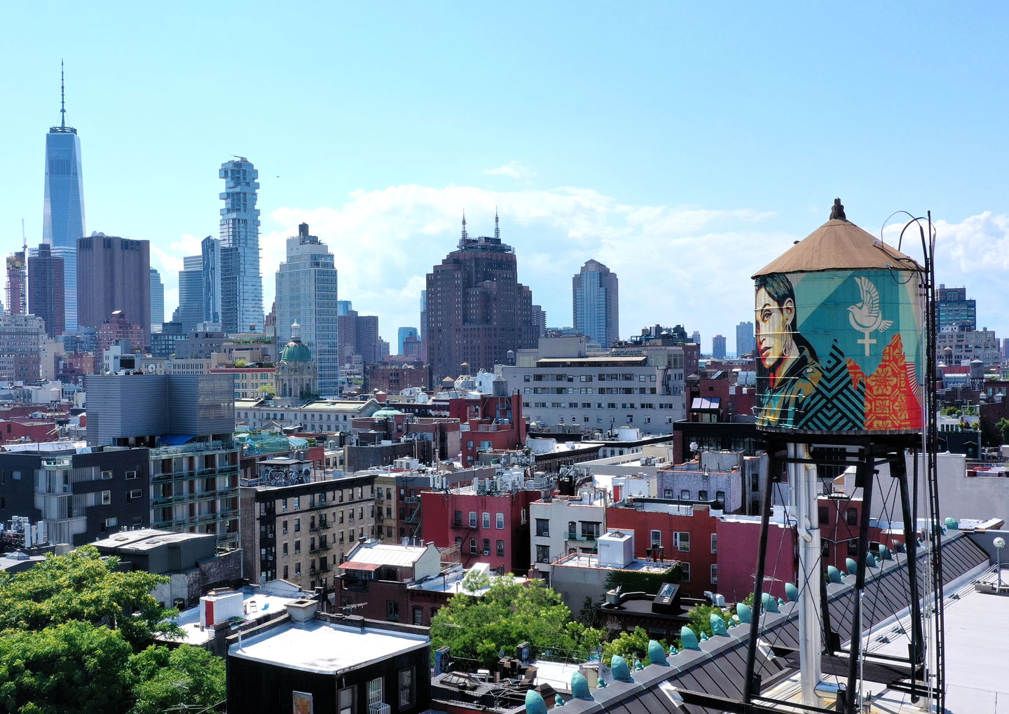 In collaboration with Great Bowery and street art legend Shepard Fairey, Overall took on a project in the Lower East Side of Manhattan on the historic street of Bowery. Atop the old Germania Bank Building, a building once home to renowned photographer Jay Maisel, sits an old water tower visible from any surrounding corner in this busy SoHo neighborhood.